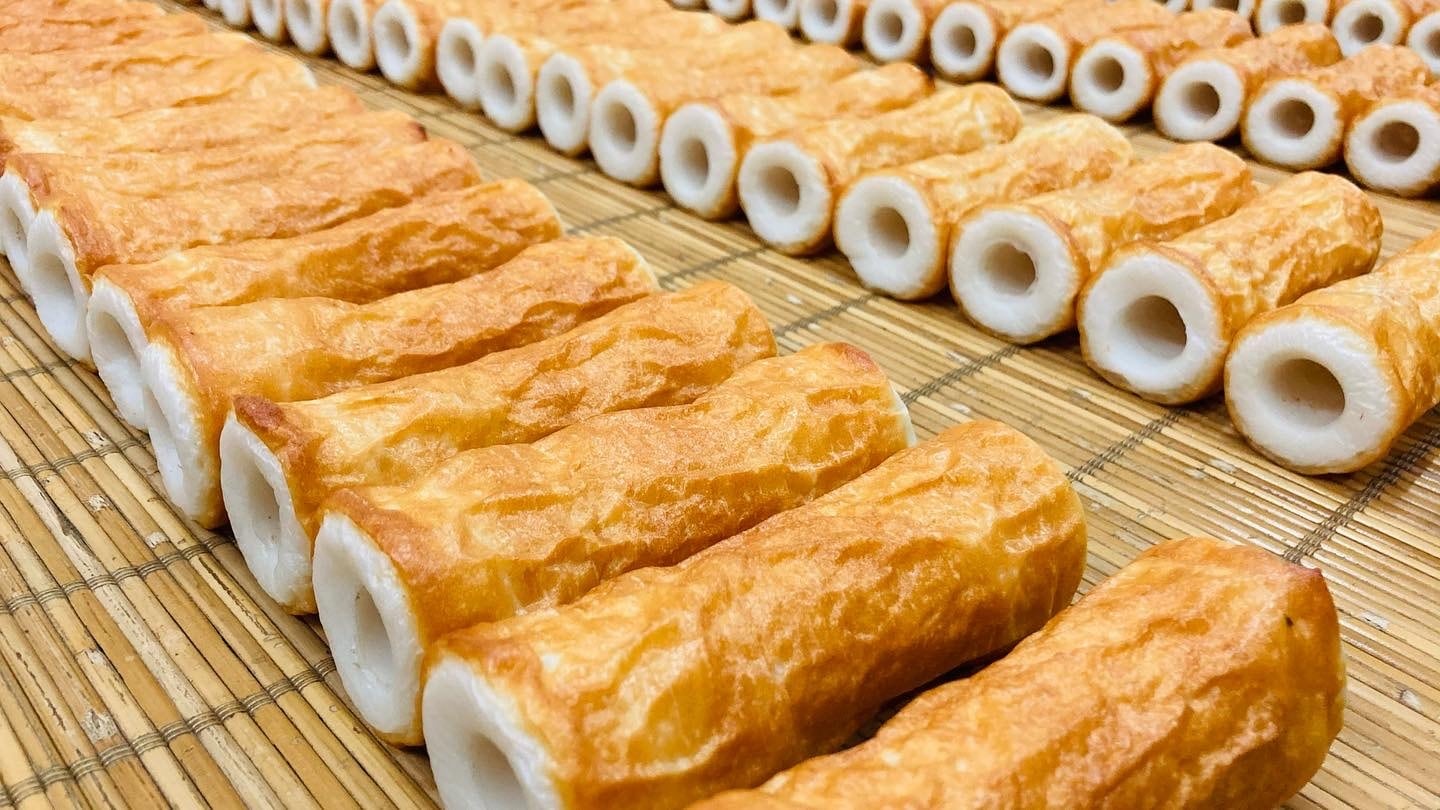 祝いの席や、お正月には欠かせない逸品の『旭巻き』です。ゆで卵を蒲鉾で巻き込み、一本一本、職人の手で丁寧に作られています。